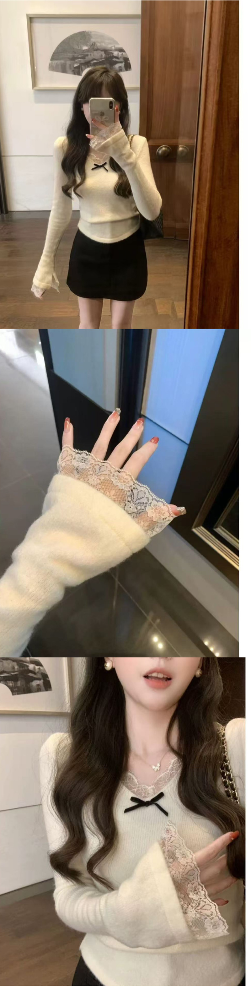 ALORA 蝴蝶結滾邊蕾絲喇叭袖上衣