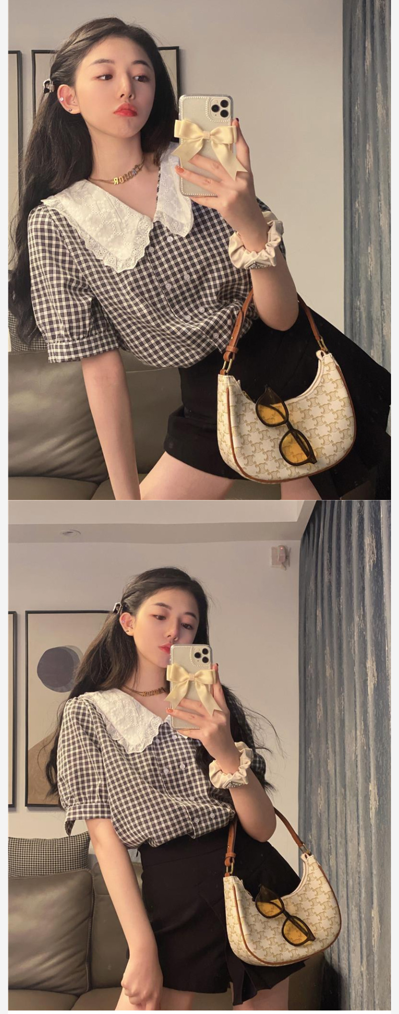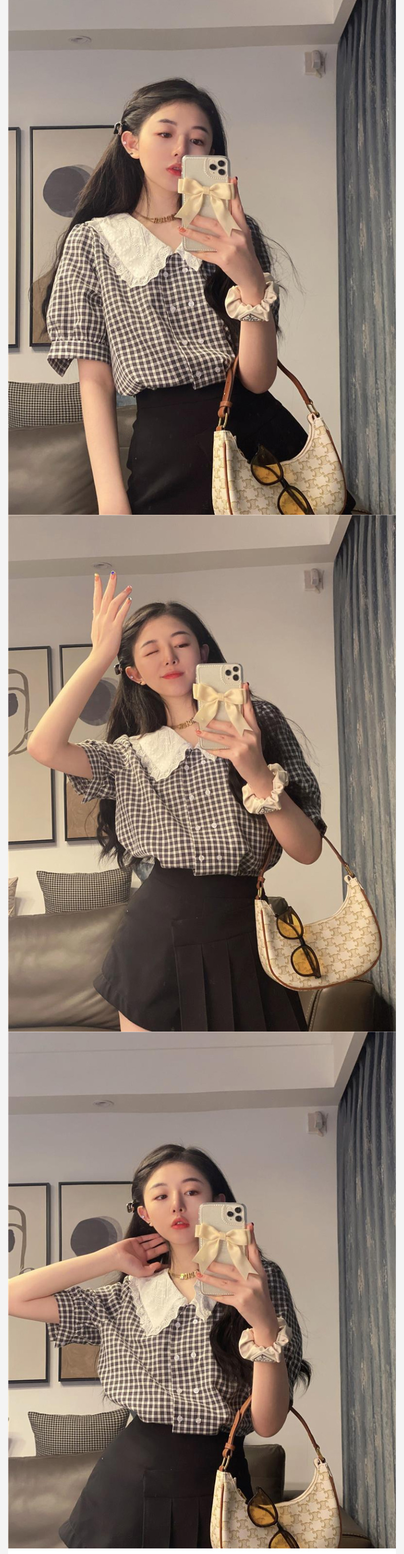 ALORA 蕾絲翻領黑白格襯衫,ALORA