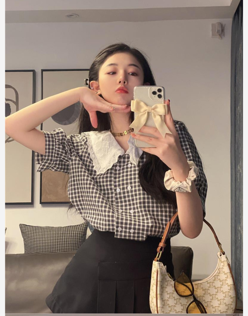 ALORA 蕾絲翻領黑白格襯衫