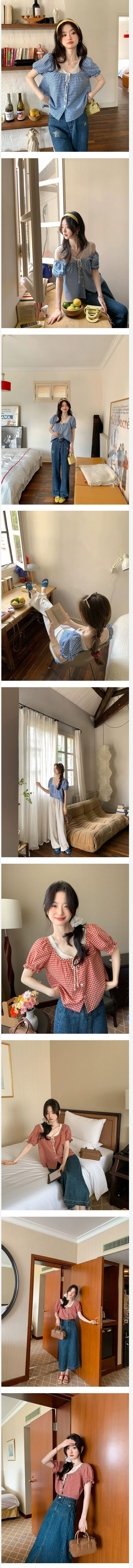ALORA 藍色格子蕾絲假兩件上衣