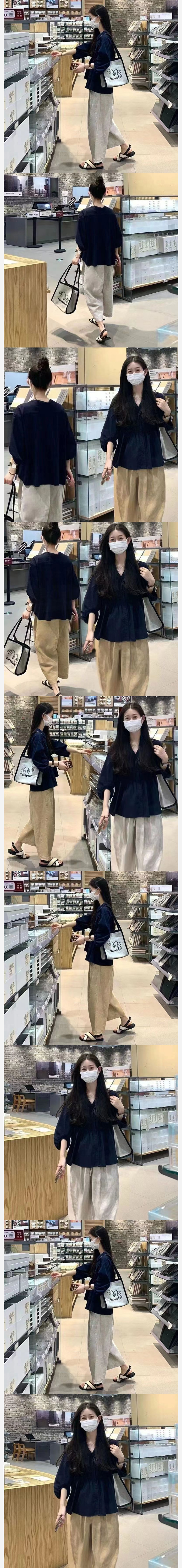 ALORA 韓系深藍泡泡袖V領上衣