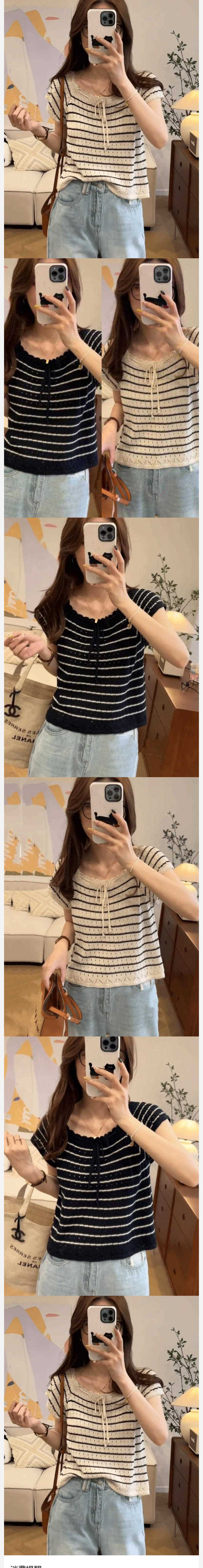 ALORA 領口綁帶橫條紋針織上衣,ALORA